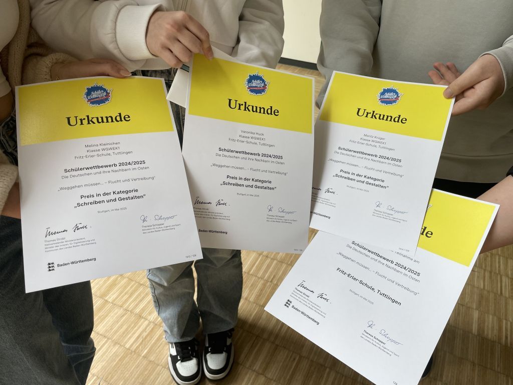 Drei Schüler*innen der Klasse WGWEK1 haben Arbeiten eingereicht, die die Jury überzeugten. Herzlichen Glückwunsch! Melina Kleinichen erforschte Biografien von Menschen, die im Landkreis Tuttlingen nach und während des zweiten Weltkrieges ankamen. Für diese Arbeit war richtige Historikerarbeit nötig und es wurde sogar im Kreisarchiv recherchiert. Moritz Krüger konnte mit einer kreativen Arbeit überzeugen. Am 31. Mai 1945 musste die deutschsprachige Bevölkerung der Region Mähren im heutigen Tschechien den Landstrich verlassen. Frauen, Kinder und einige ältere Männer wurden aus der Stadt Brünn zu Fuß ins sowjetisch besetzte Österreich vertrieben. Viele überlebten den Fußmarsch nicht. Kindern bot oft Spielzeug Trost, Halt und Sicherheit. So hatte ein fünfjähriges Mädchen beim sogenannten „Brünner Todesmarsch“ eine Puppe bei sich, die sich heute im Sudetendeutschen Museum in München befindet. Was die Puppe ihrer nunmehr über 80-jährigen Besitzerin schreiben würde, präsentierte Moritz in seiner Arbeit. „Schrecklich, aber wahr – ein Podcast zur Deportation der Russlanddeutschen“ mit diesem Thema setzte sich Veronika Huck auseinander und produzierte einen ansprechenden und informativen Podcast.